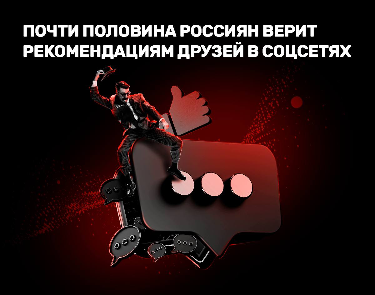 Согласно недавнему исследованию «Анкетолога» и MOTIVE agency&production, больше всего россияне доверяют рекомендациям товаров и услуг от друзей в соцсетях. 47% опрошенных, то есть почти каждый второй, принимает решение о покупке относительно мнения о продукте своего друга.