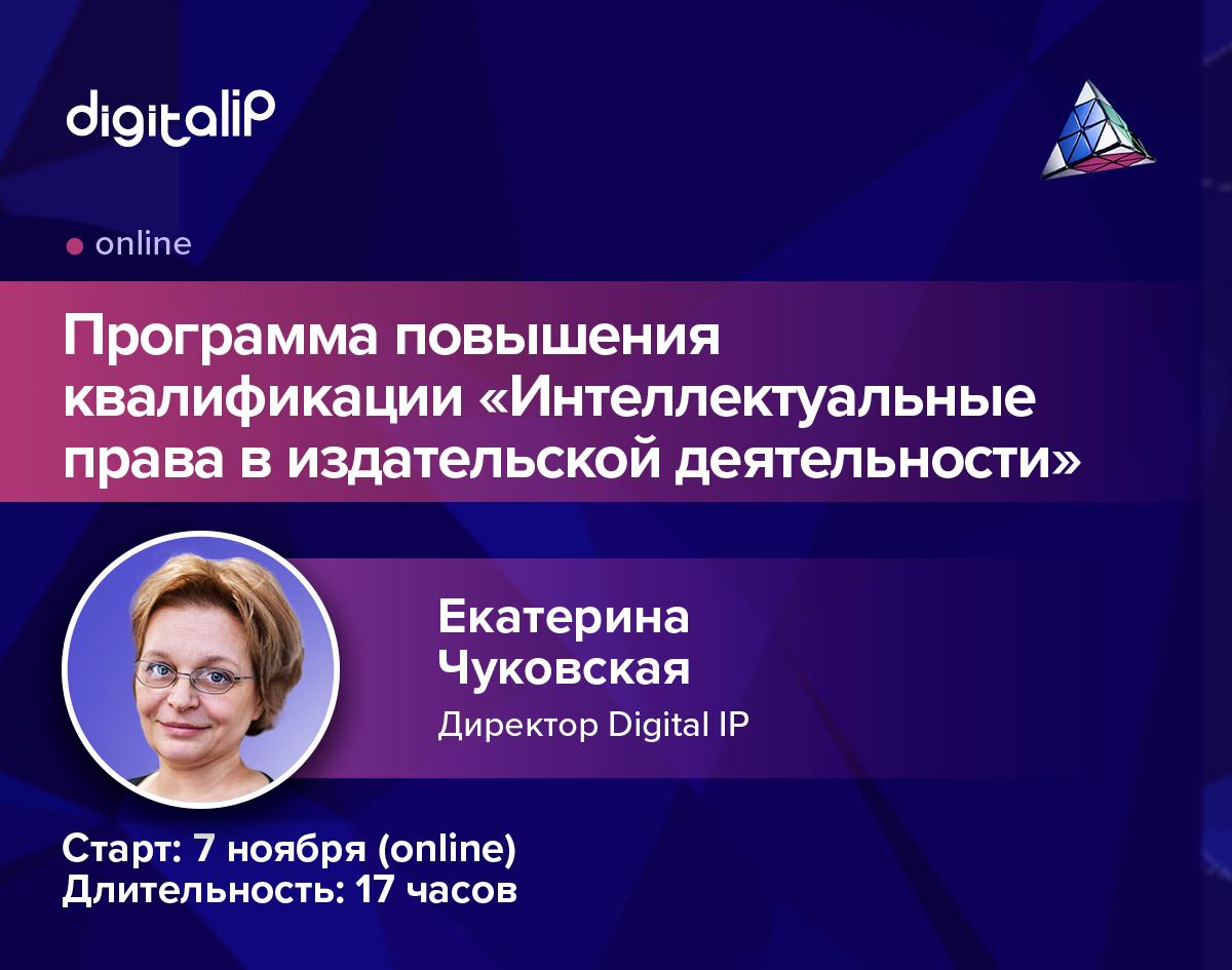 Приглашаем вас на онлайн-курс «Интеллектуальные права в издательской деятельности». Это полноценная программа повышения квалификации, которая стартует уже 7 ноября. Организатор ― Научно-образовательный центр интеллектуальной собственности и цифровой экономики Digital IP. Лектор ― директор центра Екатерина Чуковская.