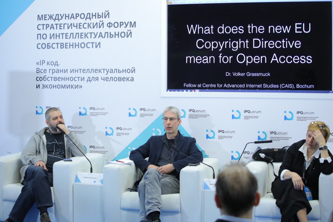 Одной из заключительных сессий первого дня форума стала презентация исследования «Определение подходов к расширению доступа к информации, знаниям, произведениям науки, литературы и искусства и объектам смежных прав с учетом соблюдения интеллектуальных прав правообладателей», которая прошла в зале «Оникс-2». Спикерами сессии стали: Волкер Грасмук (Volker Grassmuck), медиасоциолог, член Правления «Digitale Gesellschaft», Екатерина Чуковская, вице-президент по R&D Федерации интеллектуальной собственности (ФИС) и Владимир Харитонов, исполнительный директор Ассоциации интернет-издателей.