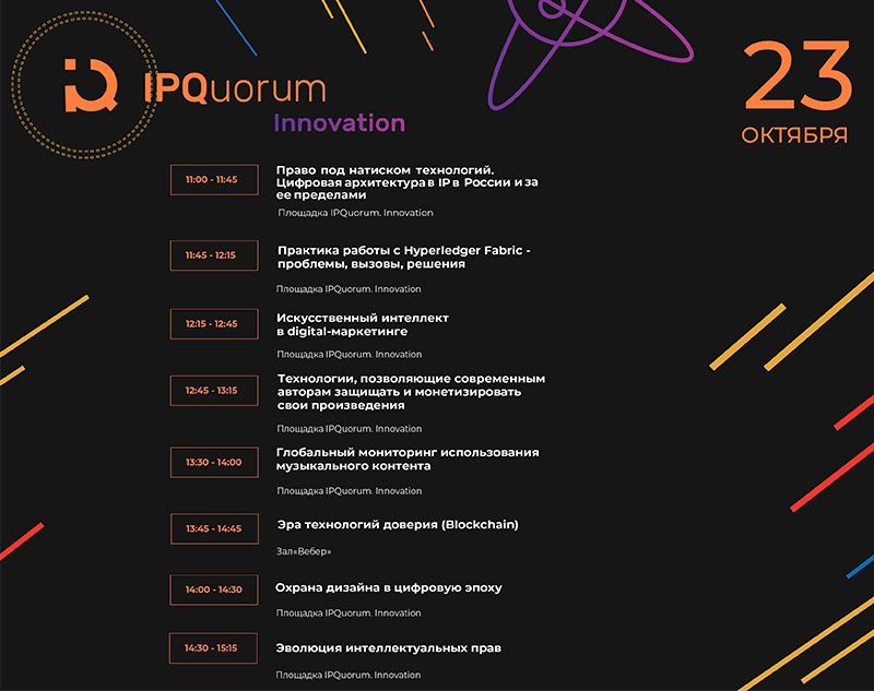 Гости лекционного пространства стенда IPChain узнают о цифровой архитектуре IP России и за ее пределами, практике работы с Hyperledger Fabric, искусственном интеллекте в digital-маркетинге, блокчейне в качестве инструмента формирования среды доверия, охране дизайна в цифровую эпоху, технологиях монетизации ИС, глобальном мониторинге использования музыкального контента и эволюции интеллектуальных прав.