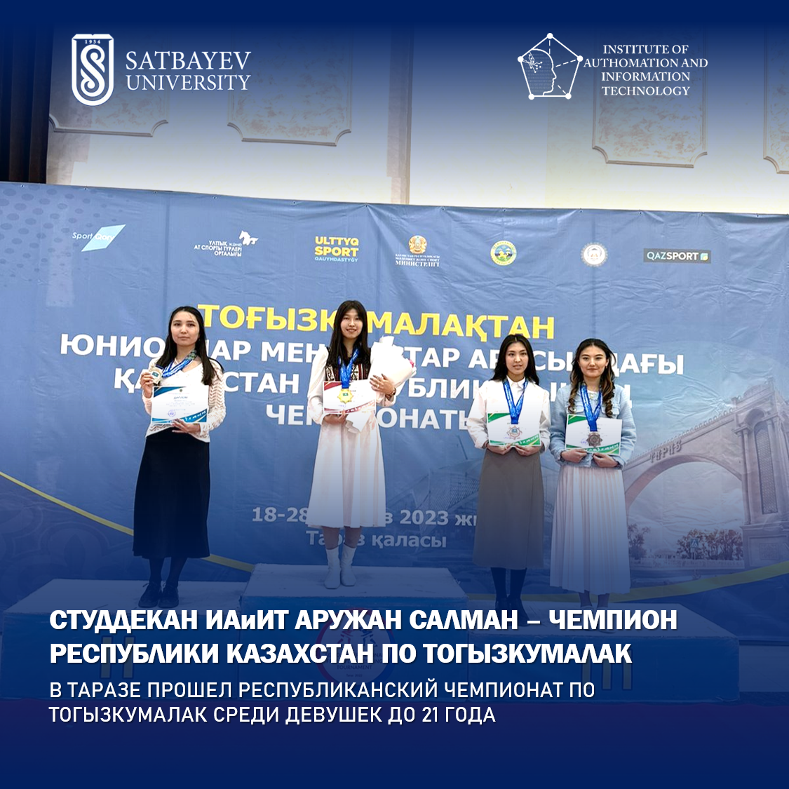 Автоматика және ақпараттық технологиялар институтының студенттік деканы Аружан Салман - тоғызқұмалақтан 21 жасқа дейінгі қыздар арасындағы Қазақстан Республикасының чемпионатында блиц түрінен I орын алды