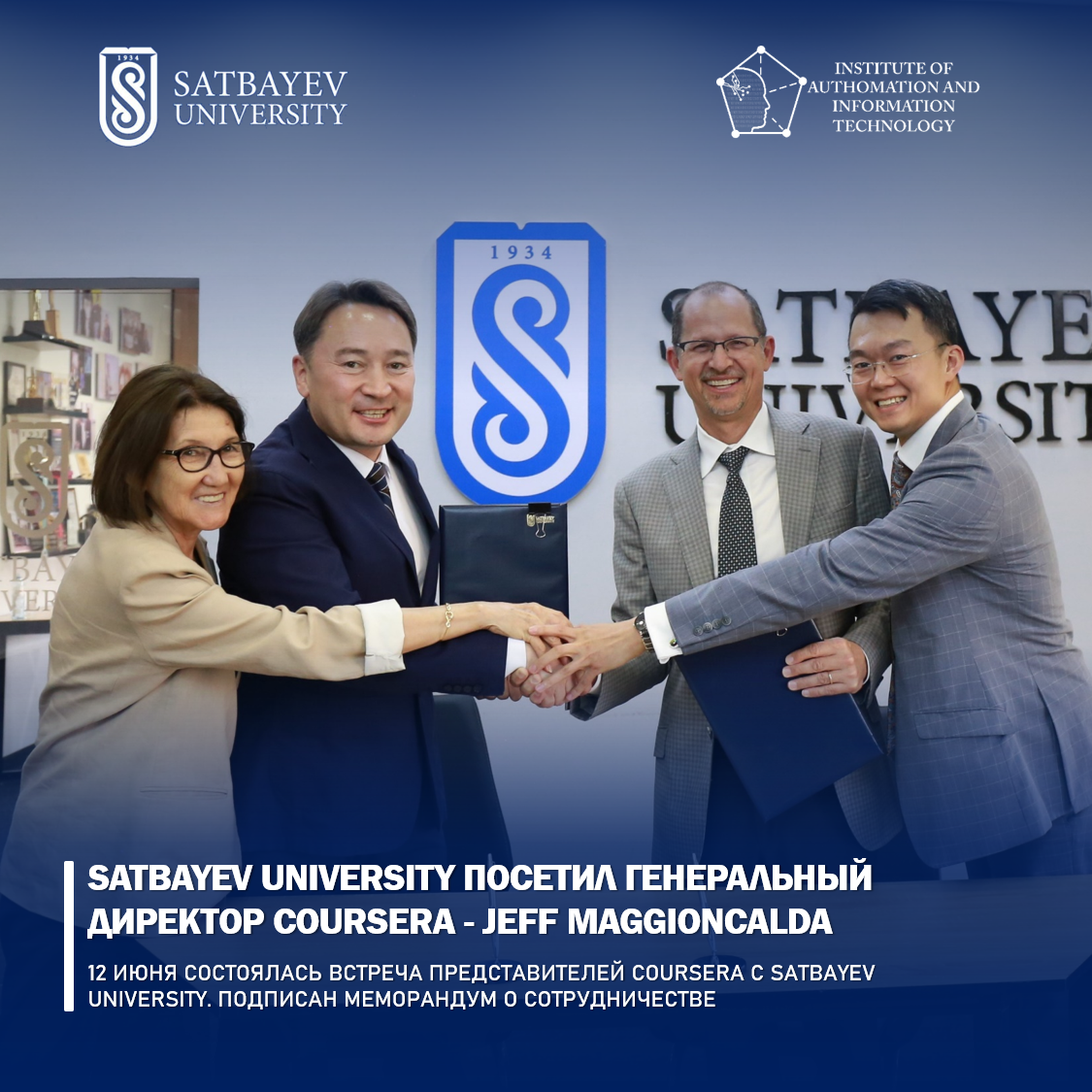 12 июня в Satbayev University состоялась встреча с представителями Coursera - Джефф Маджионкалда (Jeff Maggioncalda) - Генеральный директор Coursera, Бибин Шивас (Bibin Shivas) - Директор по работе с клиентами в регионе APAC, Ништа Кумар (Nishtha Kumaar) - Директор по связям с общественностью в регионе APAC, Эдуард Кан - Директор по развитию бизнеса в Казахстане и Центральной Азии. От Satbayev University присутствовали Мейрам Бегентаев – Председатель Правления, Ректор Satbayev University, Раиса Ускенбаева – Директор Института автоматики и информационных технологий, Айжан Анартаева – Директор Центра цифровой трансформации образования, Жулдыз Кальпеева – Зам.директора Института автоматики и информационных технологий и Айжан Касымова - Зам.директора Института автоматики и информационных технологий.
