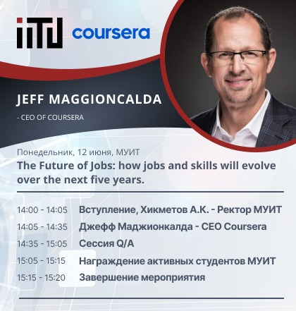 Мы рады пригласить Вас, на public talk IITU с генеральным директором Coursera Джефф Маджионкалда на тему «The Future of Jobs: how jobs and skills will evolve over the next five years», который пройдет 12.06.2023г. в 14:00, в АО «МУИТ», по адресу Манаса 34/1.