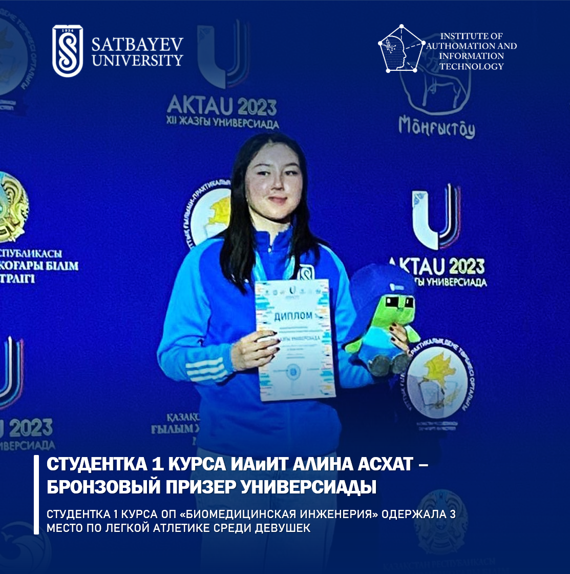 Сәтбаев Университетінің "Биомедициналық инженерия" бағыты бойынша 1 курс студенті Алина Асхат Қазақстан Республикасы жоғары оқу орындарының студенттері арасында "XII жазғы универсиадада" жеңіл атлетикадан қыздар арасында "Балға лақтыру" -дан 3 орынға ие болды.