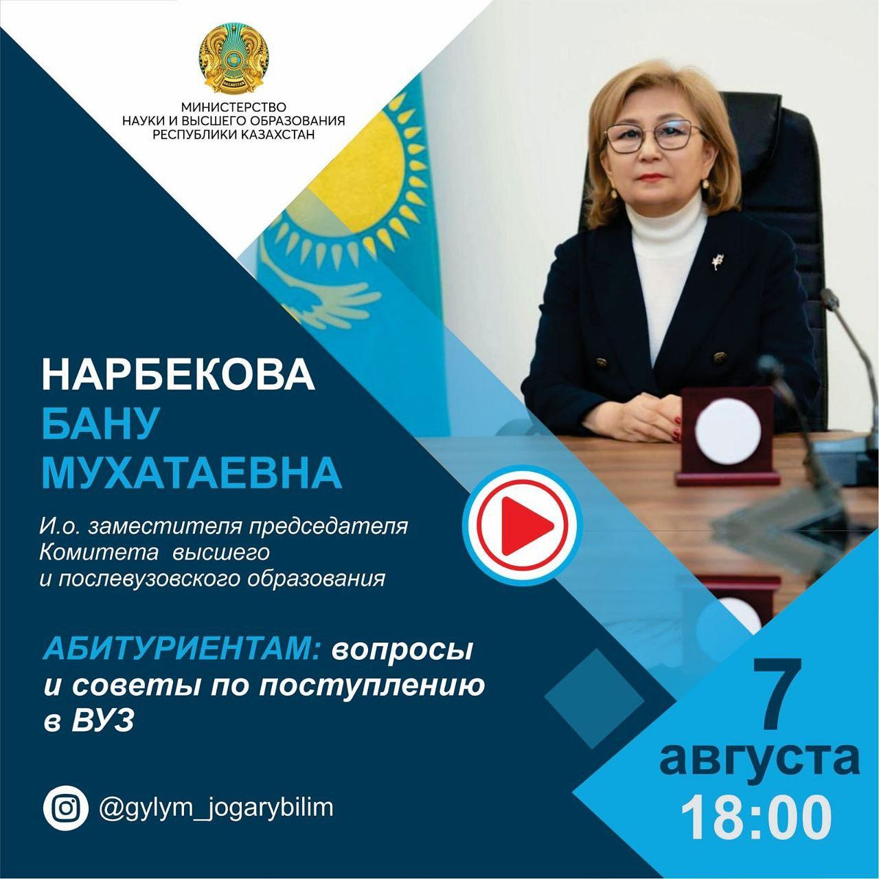 🎓 Уважаемые абитуриенты, сегодня состоится прямой эфир на странице Министерства науки и высшего образования РК в Instagram с участием и.о. председателя Комитета высшего и послевузовского образования Нарбековой Бану Мукатаевны на тему «Абитуриентам: вопросы и советы по поступлению в вузы».