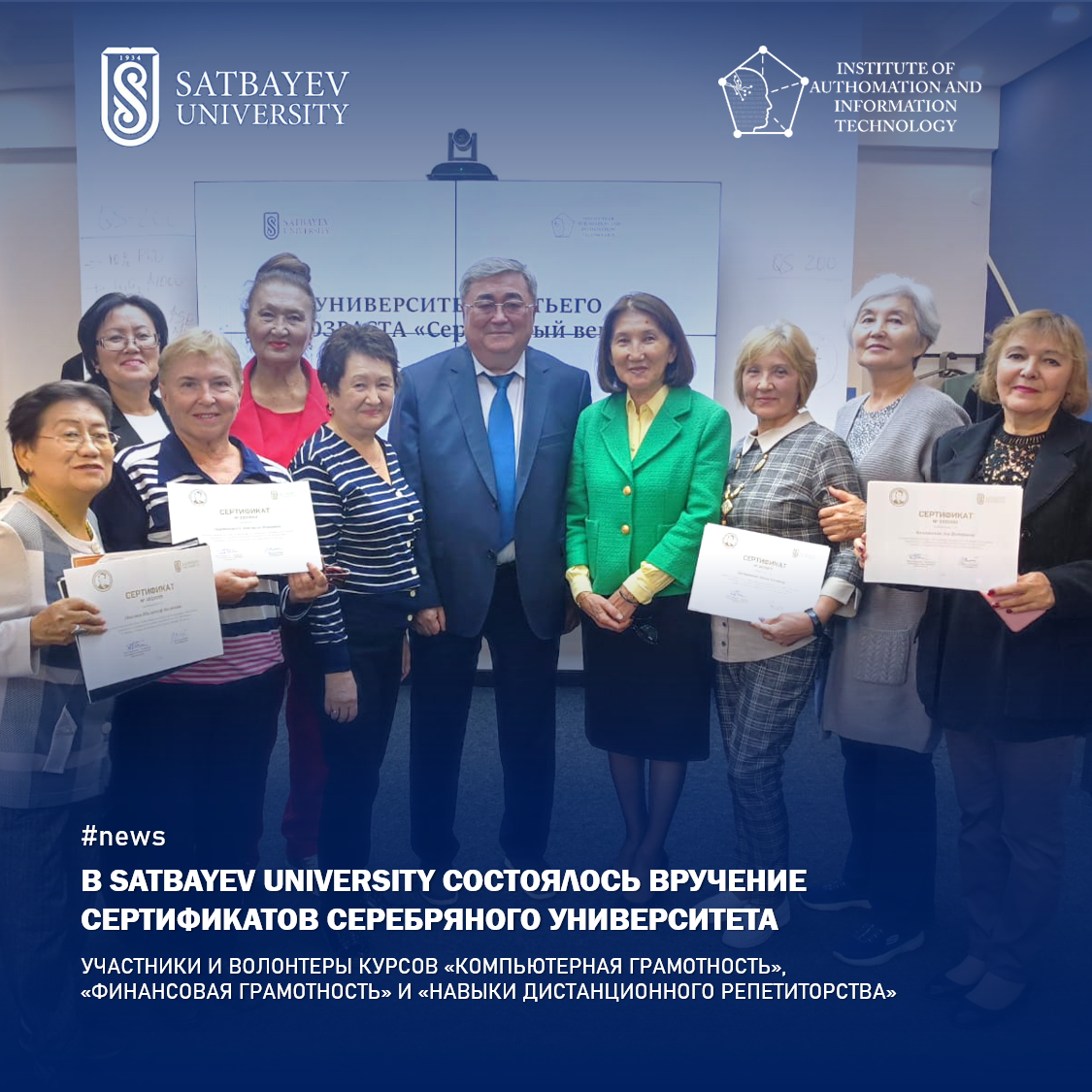18 сентября состоялось торжественное вручение сертификатов выпускникам «Серебряного Университета». В период с 24 мая по 9 июня 2023 года в Satbayev University проходил курс «Компьютерная Грамотность» в рамках «Серебряного университета», который призван обучить пенсионеров основам использования персонального компьютера. Курс разработан с учетом возрастных особенностей и уровня знаний участников, многие из которых имели ограниченный опыт работы с компьютерами или впервые столкнулись с этой технологией.