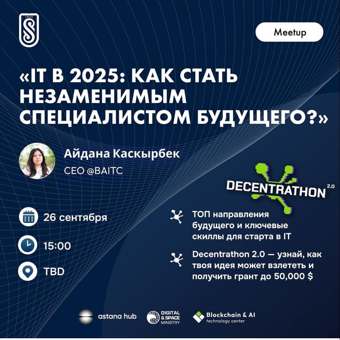 Satbayev University және Blockchain & AI Technology Center (BAITC) сені IT саласындағы мансабыңды өзгертетін грандиозды митапқа шақырады!