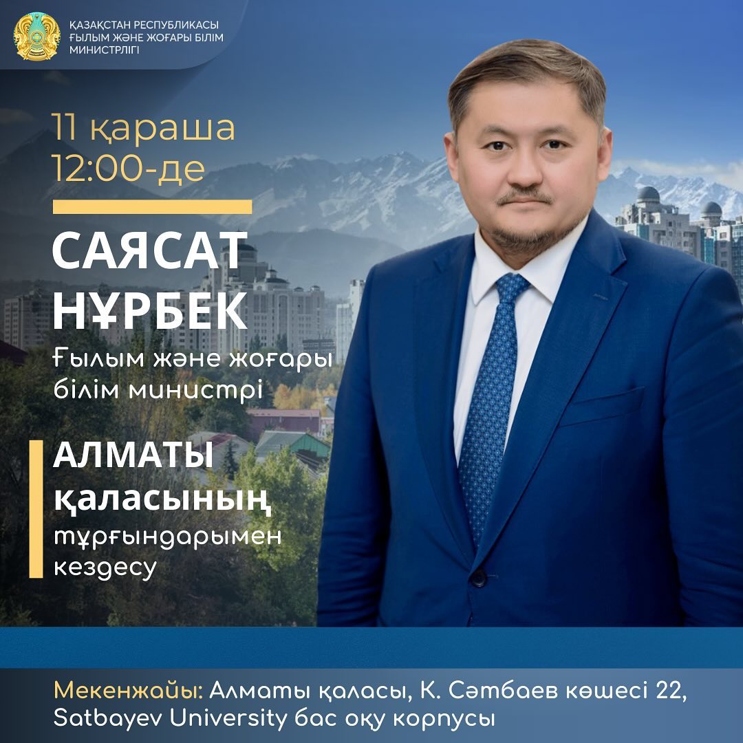 ⚜️ 2024 жылғы 11 қарашада сағат 12.00-де ҚР Ғылым және жоғары білім министрі Саясат Нұрбектің ғылым және жоғары білім саласын дамыту мәселелері бойынша Алматы қаласының тұрғындарымен кездесуі өтеді.