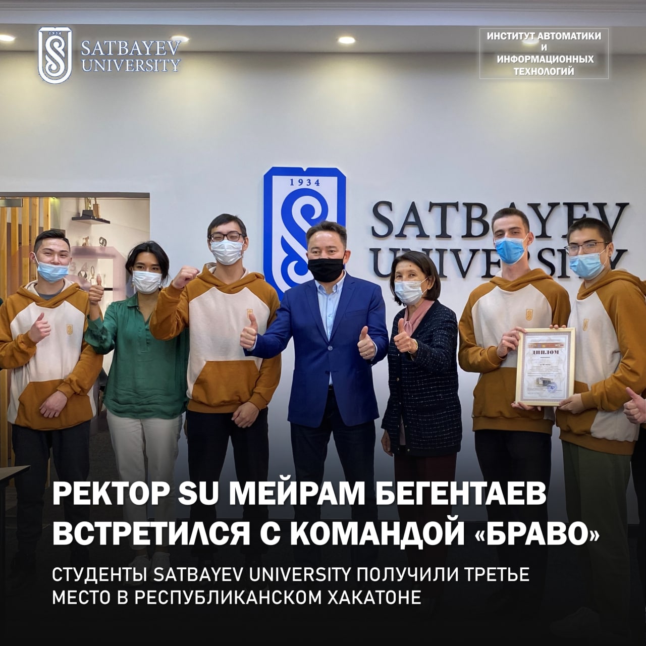 Сегодня с ними встретился ректор Satbayev University - Мейрам Мухаметрахимович Бегентаев. Ректор выразил благодарность команде за успешное выступление от имени университета и пожелал ребятам профессионального развития и роста в сфере IT. Команда «Браво» поблагодарили ректора - Бегентаева Мейрама Мухаметрахимовича и директора ИАиИТ - Ускенбаеву Раису Кабиевну за оказанную поддержку в развитии команды.