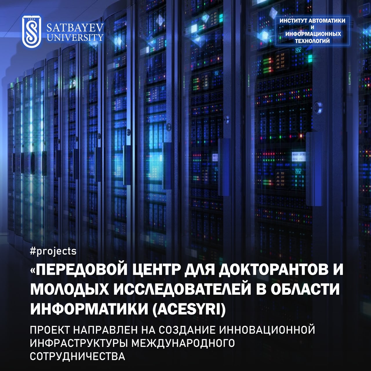 Проект создания центра для докторантов и молодых исследователей в области информатики (ACeSYRI) направлен на создание инновационной инфраструктуры международного сотрудничества между студентами, исследователями и преподавателями казахстанских и европейских университетов. Этот проект приблизит образование докторантов к общепринятым международным правилам и нормам, основанным на интернационализации послевузовского образования.