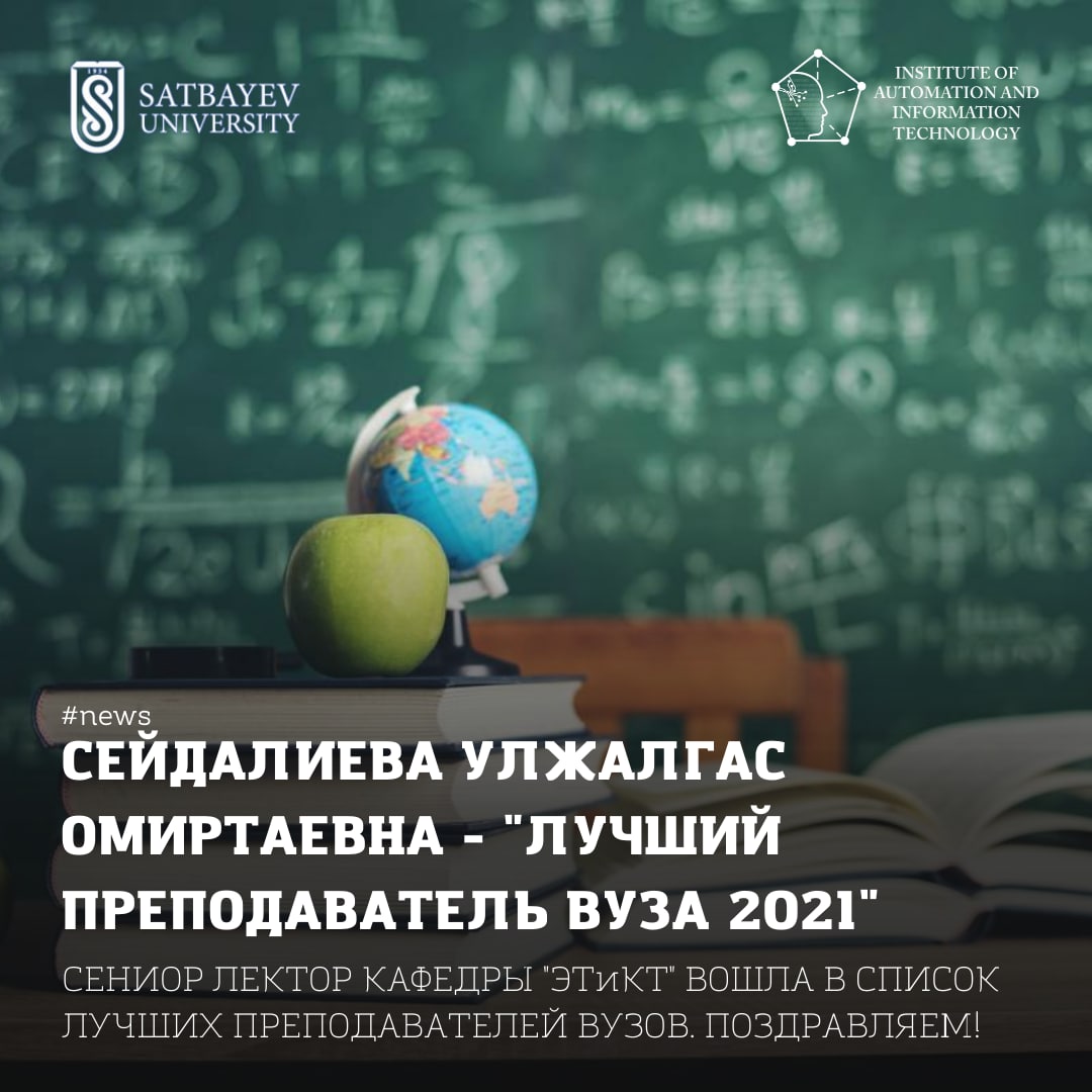 Сениор-лектор кафедры "Электроники, телекоммуникации и космических технологий" Института Автоматики и Информационных Технологий Сейдалиева Улжалгас Омиртаевна стала победителем конкурса лучшего преподавателя вуза. На кафедре "ЭТиКТ" Улжалгас Омиртаевна работает с 2016 года.