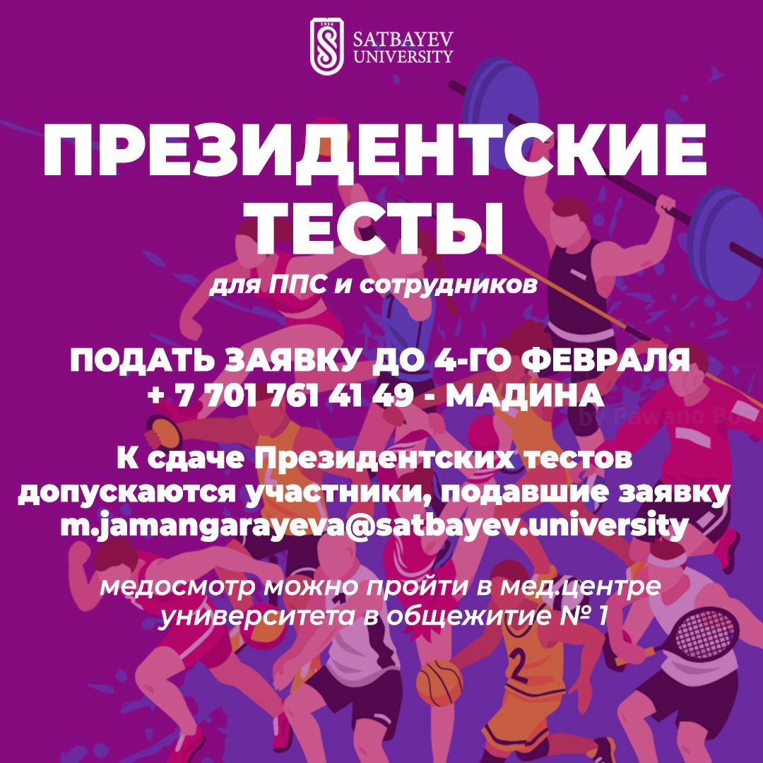 К сдаче Президентских тестов допускаются участники, подавшие заявку на почту m.jamangarayeva@satbayev.university, вн. 7085 - кафедра физической культуры, для участия не позже 4 февраля и прошедшие медицинский осмотр.