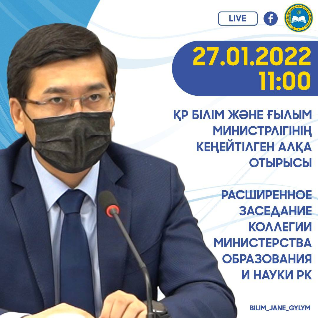 2022 жылғы 27 қаңтар күні сағат 11:00-де ҚР Білім және ғылым министрлігінің кеңейтілген алқа отырысы өтеді. Жиында министрліктің 2021 жылы атқарған жұмыстарының қорытындысы мен 2022 жылға қойылған міндеттері талқыланады.