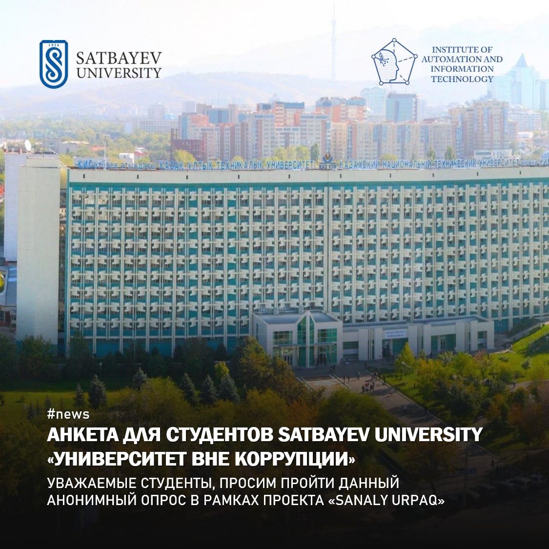 "Sanaly urpaq" жобасы шеңберінде Сәтбаев университетінде студенттердің пікірін зерделеу және сыбайлас жемқорлыққа қарсы мәдениетті қалыптастыру мақсатында университетте анонимді әлеуметтік зерттеу жүргізілуде. Сізден сауалнаманың барлық сұрақтарына жауап беруіңізді сұраймыз. Біз сіздің жеке пікіріңізді бағалаймыз.