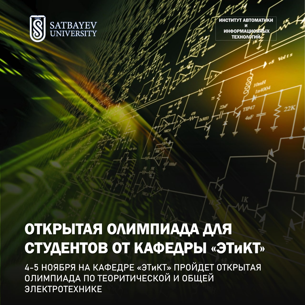 Кафедра “Электроника, телекоммуникации и космические технологии” объявляет о проведении открытой олимпиады по теоретической и общей электротехнике