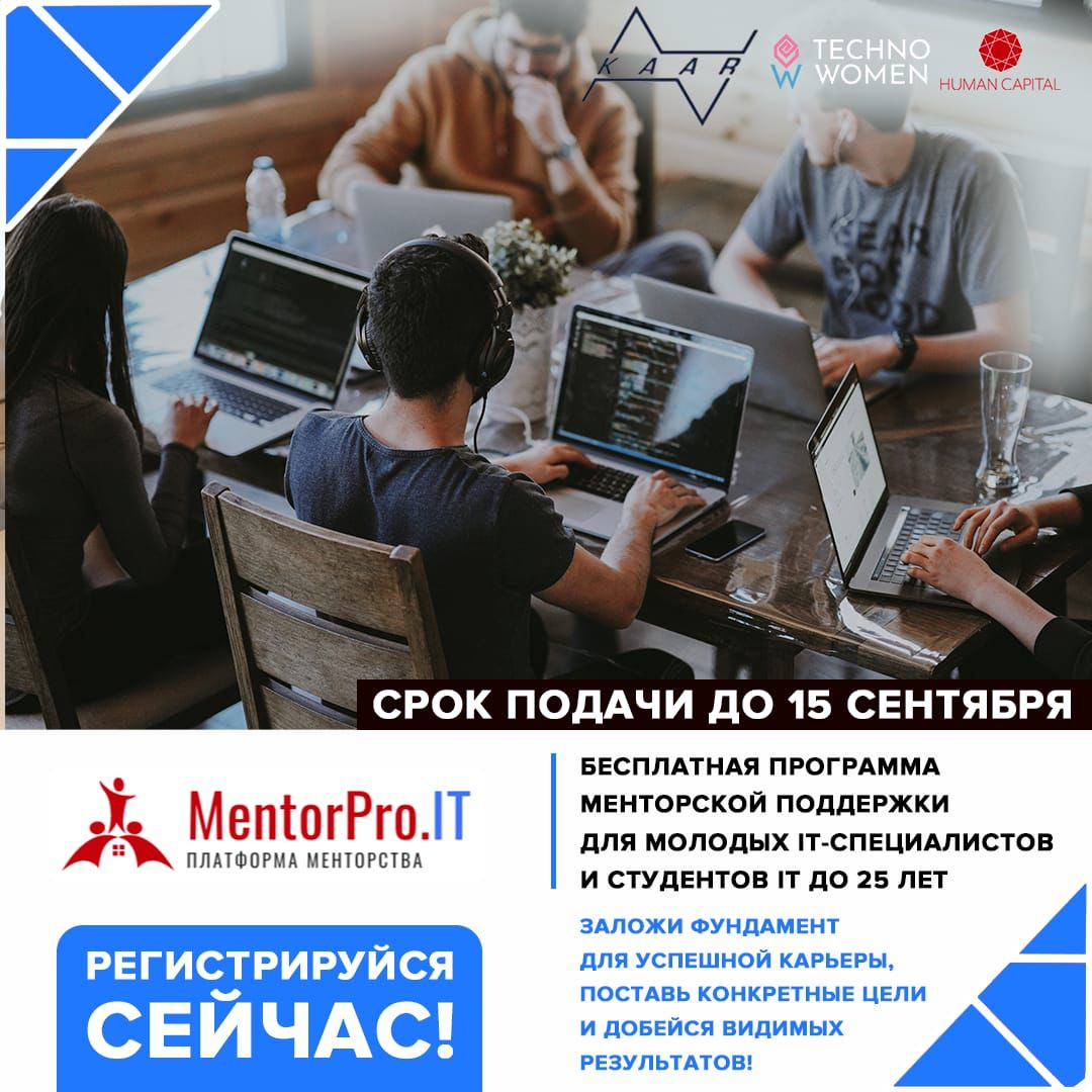 Компания Human Capital при поддержке «Казахстанской ассоциации автоматизации и робототехники», совместно с информационным партнером TechnoWomen запускает уникальную программу под названием MentorPro.IT для амбициозных студентов и молодых специалистов по специальностям ИТ и промышленной робототехники в возрасте 18-25 лет.