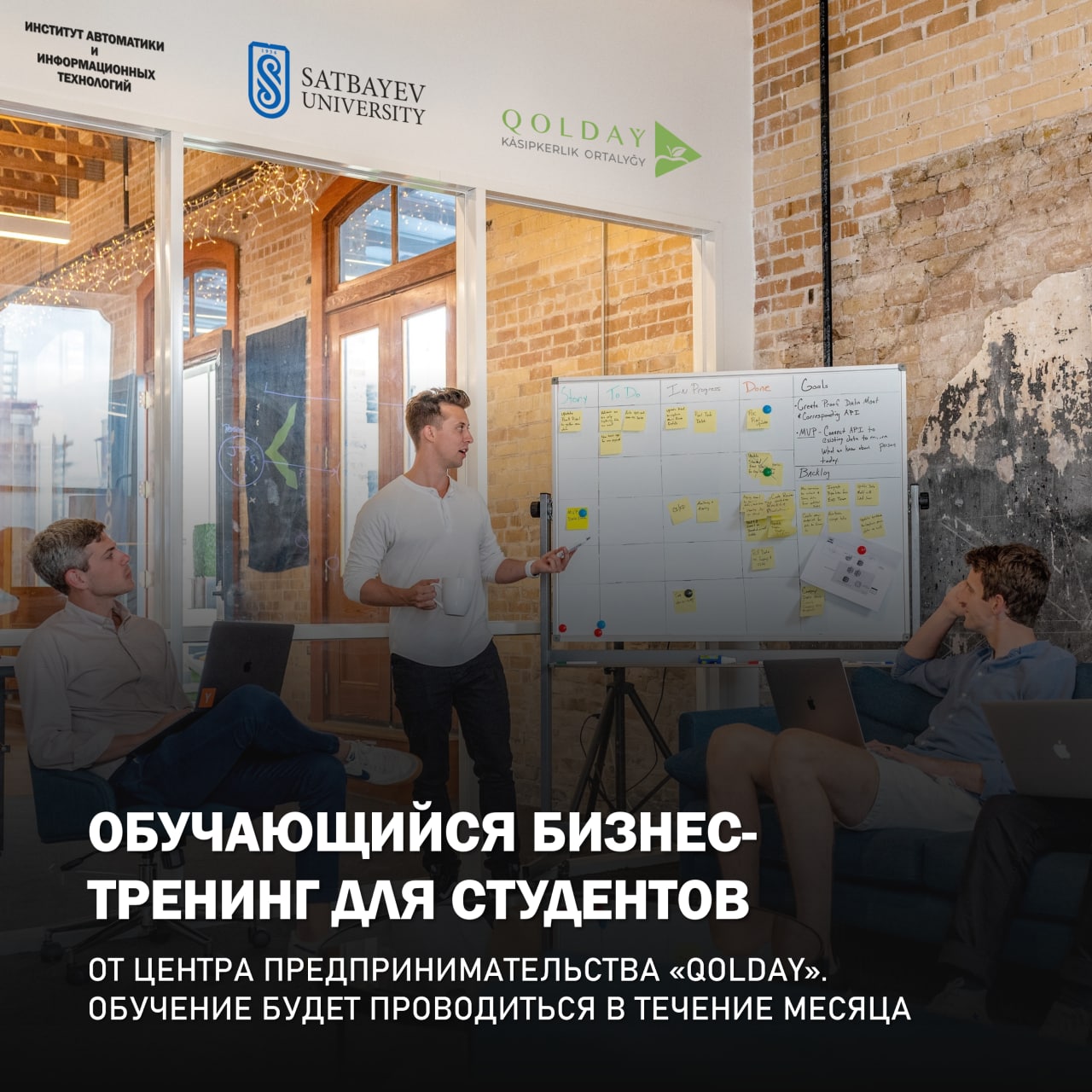 В рамках меморандума о сотрудничестве между КазНИТУ им. К.И.Сатпаева и ТОО «Центр предпринимательства Qolday» планируется проведение бесплатного обучающего бизнес-тренинга для студентов старших курсов, имеющих бизнес-инициативу и желающих открыть свой бизнес.