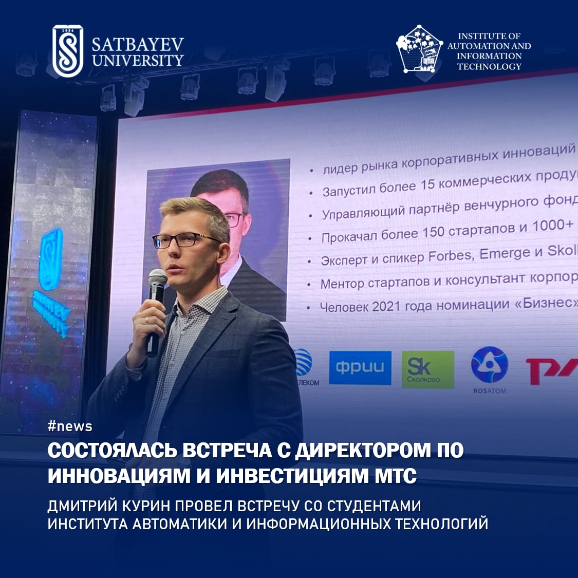 Дмитрий поделился опытом компании МТС по корпоративным инновациям и стартап-проектам. Как предпринимателю лучше развиваться, как компании строить план стратегического развития и как стартап-проектам найти венчуров и акселераторов. Об этом и многом другом рассказал Дмитрий Курин на сегодняшней встрече со студентами ИАиИТ.