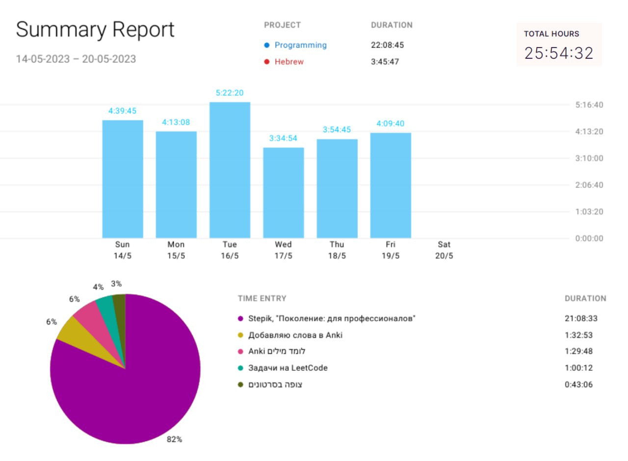 За прошлую неделю отчета не было, поэтому выкладываю сразу два 🔥. Началась жара, очень душно и голова работает хуже 🥵. Дольше 3-х сфокусированных часов с перерывами на еду я выдерживаю с трудом. Однако, темп в 20+ часов в неделю считаю вполне допустимым, эдакая "нижняя граница продуктивности".
