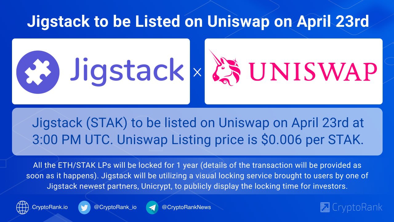 Jigstack (STAK) to be listed on Uniswap on April 23rd at 3:00 PM UTC. Uniswap Listing price is $0.006 per STAK.