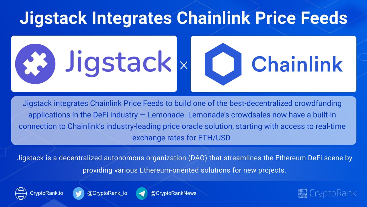 Jigstack integrates Chainlink Price Feeds to build one of the best-decentralized crowdfunding applications in the DeFi industry — Lemonade. Lemonade’s crowdsales now have a built-in connection to Chainlink’s industry-leading price oracle solution, starting with access to real-time exchange rates for ETH/USD.