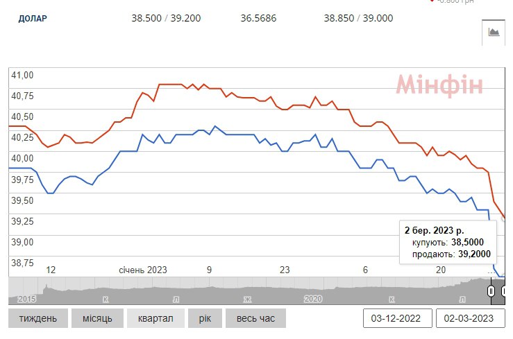За два місяці 2023 року курс долара США на готівковому ринку України втратив 1,7 гривні і знизився до рівня середини 2022 року.