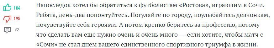 Резюме: статья интересная, вызывает резонанс. Но она слаба по факту и не берет в расчет кучу нюансов: от выхода «Сочи» против «Ростова» молодежью - до роли Прядкина в этой истории. Ну в общем, такое себе чтиво. С другой стороны раз оно вызвало отклик, значит оно нужно и ценно.