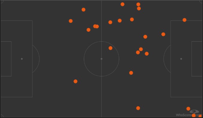 Теперь частности. Структура владения у России максимально примитивна: зацепы Дзюбы и классический перегруз флангов против схемы без вингеров (а какой изобретательности с таким составом впереди мы ждали?). Для примера, карта касаний Миранчука, действующего формально на позиции десятки — это ctrl+c ctrl+v Кузяева.
