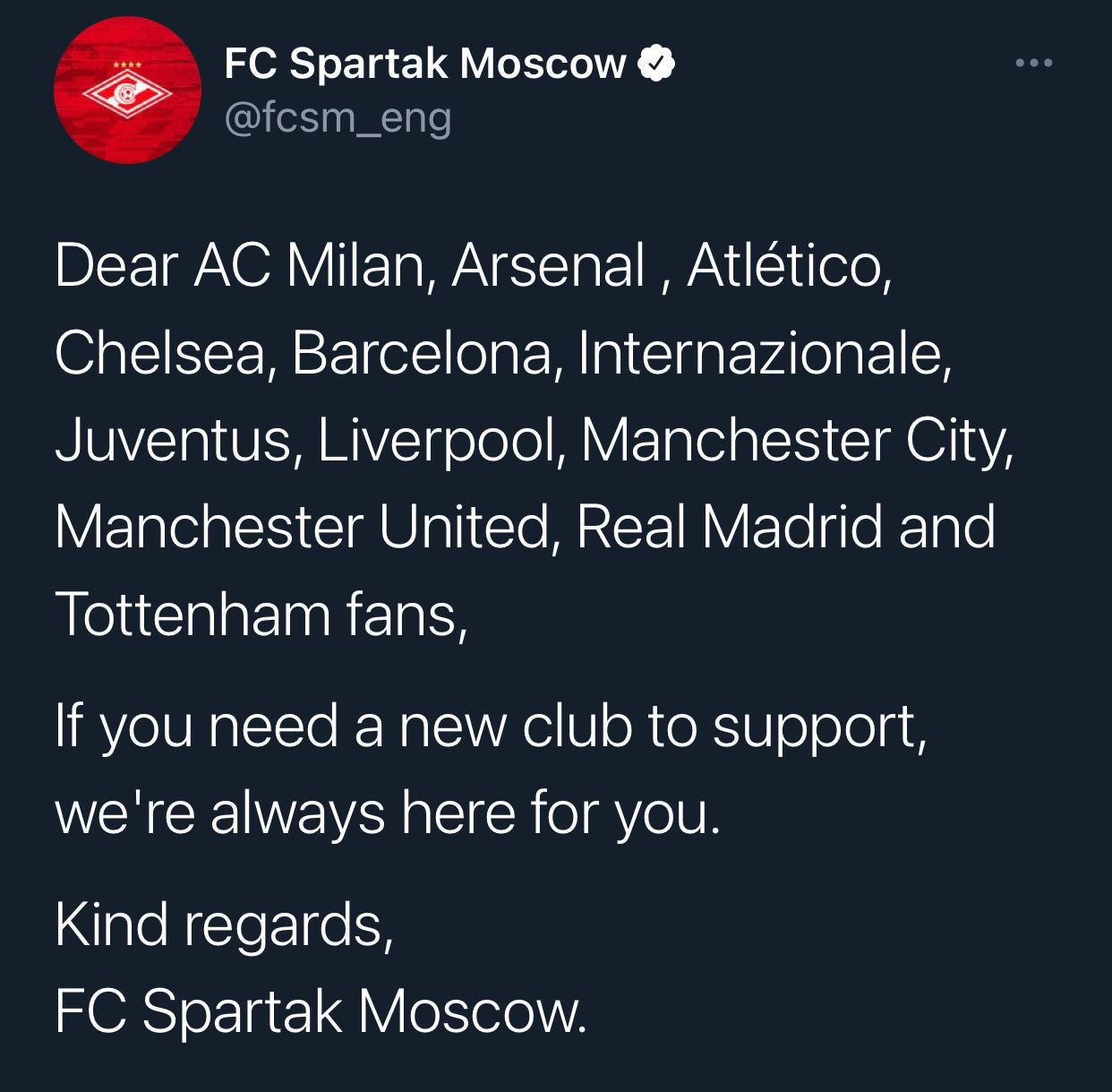 «Дорогие болельщики «Милана», «Арсенала», «Атлетико», «Челси», «Барселоны», «Интера», «Ювентуса», «Ливерпуля», «Манчестер Сити», «Манчестер Юнайтед», «Реала» и «Тоттенхэма»!
