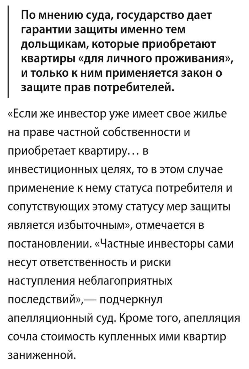 Интересным фактом считаю обращение к здравому смыслу в решению нашим судом достаточно сложных вопросов в стройке. В последние месяцы формируется судебная практика, ограничивающая в правах граждан-дольщиков, которые приобрели не одну, а несколько квартир. По мнению ряда судов, покупка квартир не для улучшения условий личного проживания, но с целью получения прибыли делает невозможной защиту таких дольщиков как обычных потребителей в случае банкротства застройщика. Этих граждан признают профессиональными инвесторами, в итоге лишая их права претендовать на жилье и даже возможности вернуть уплаченные деньги. А что если человек в долевом строительстве покупал и квартиру, и загородный дом? Вопрос пока открытый.