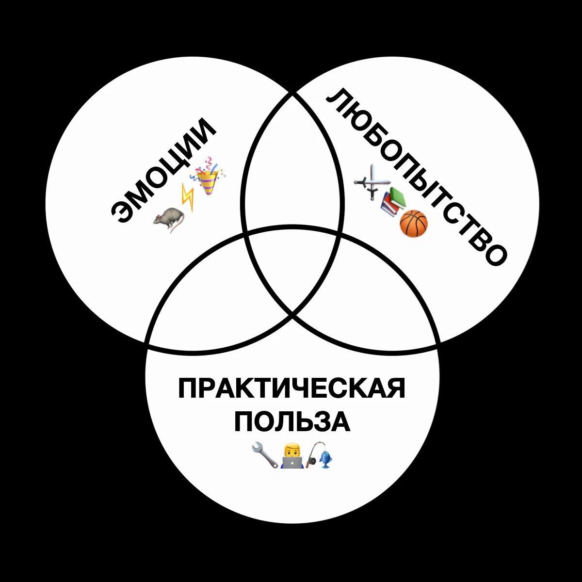 Так что каждый раз проверяй, насколько твоё выступление (или контентная стратегия) попадает в пересечение кругов. Оно, кстати, называется «трикветр» (если любишь кельтскую мифологию) или «треугольник Рело» (если любишь математику).