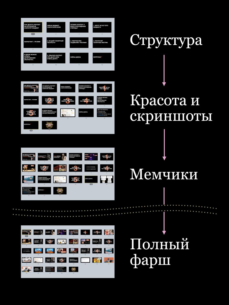 На третьем круге всё это заправляется шутками, мемами, историями о друзьям и родных и прочим оживляжем. И только после этого (если мы вдруг ещё в сознании и не спим), мы бросаемся в пучину подбора эффектов анимации и сложнейшего выбора между фейерверком и горящей наковальней.