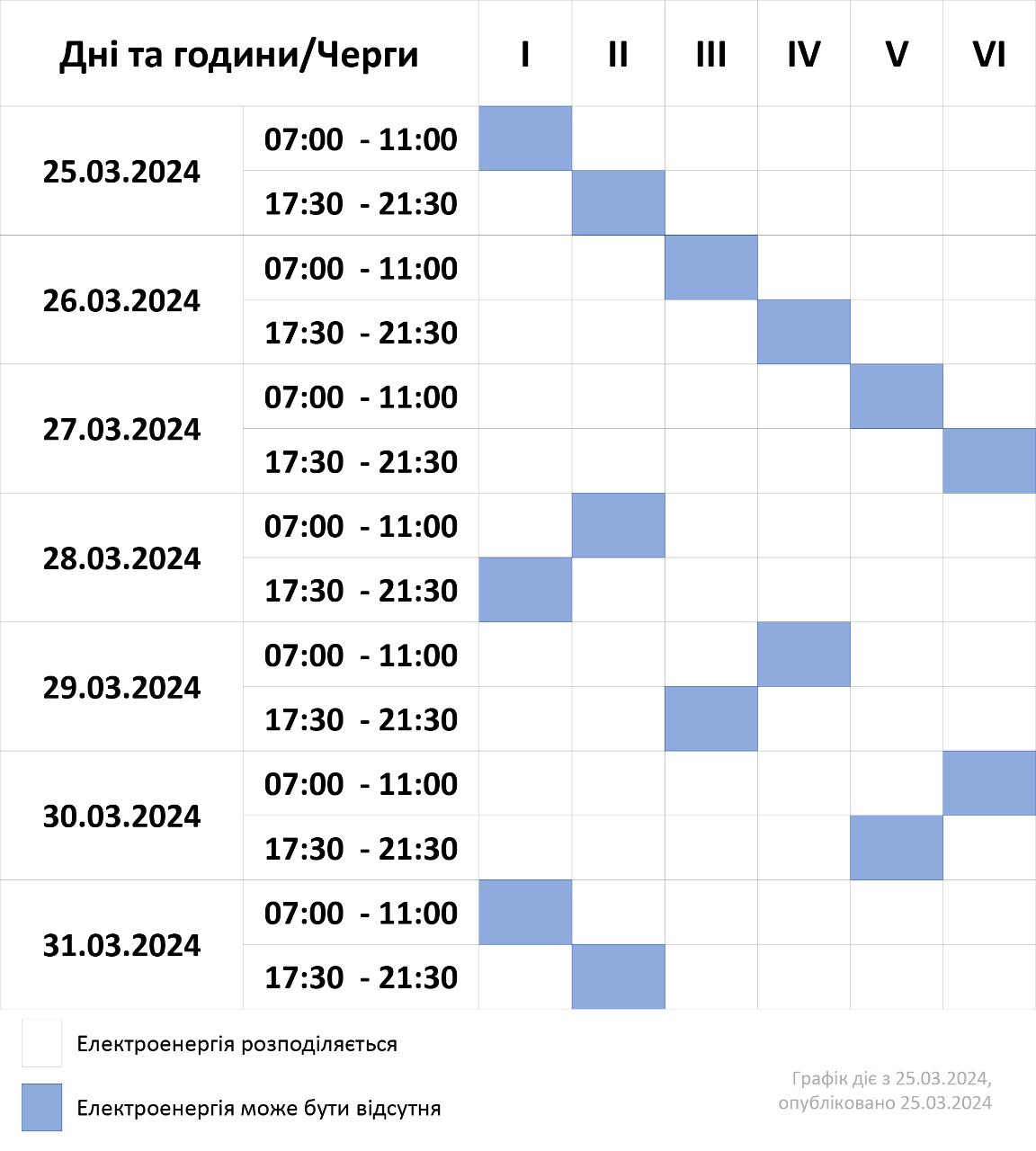 Тобто, відключатиметься одна черга зранку, з 07:00 до 11:00 та одна ввечері, з 17:30 до 21:30, виключно в періоди максимального навантаження.
