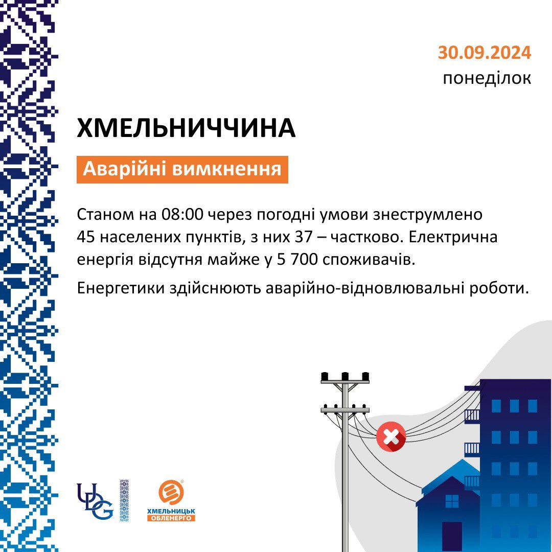 💨Станом на 08:00 30.09.2024 року через негоду, а саме зливу та пориви вітру до 15-20 м/с, знеструмлено 45 населених пунктів, з них 37 – частково. Електрична енергія відсутня майже у 5 700 споживачів.