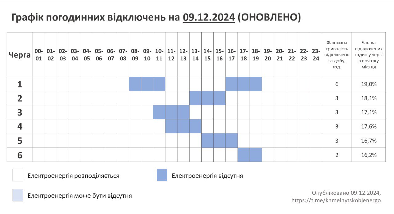 Зважаючи на погодні умови, хмарність та стан енергосистеми в цілому, обсяг обмежень може змінитися. Відслідковуйте офіційну інформацію на ресурсах АТ «Хмельницькобленерго»: сайті, Telegram та WhatsApp каналах.