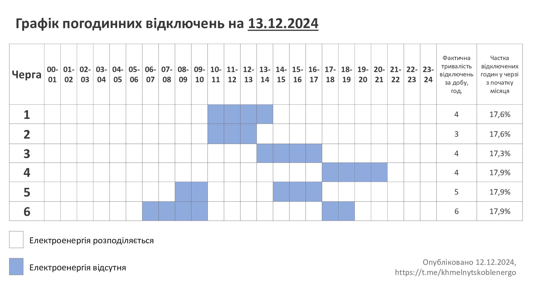 ❗У четвер, 26 грудня, за розпорядженням НЕК «Укренерго» на Хмельниччині діятиме Графік погодинних відключень з 08:00 до 21:30. Обсяг обмежень – переважно півтори черги.