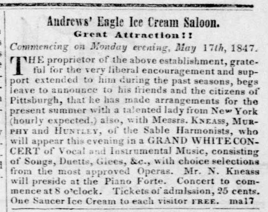 搜了下,蜜雪冰城原曲《Oh! Susanna》第一次公开演奏是在匹兹堡一家冰淇淋店里。这家冰淇淋店除了卖各种冰品还售卖糖果和蛋糕。老板为了吸引人来消费,在店里二楼搭了个音乐厅,会请人来表演古典音乐、歌剧还有滑稽戏,并且在本地报纸上大做广告。有时还会举办比赛,由观众决定获奖者。在店里消费的顾客可以免10美分门票钱。