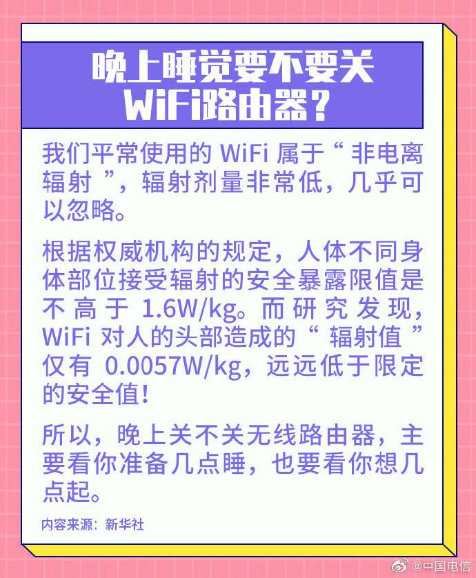 小伙伴们睡前会有关闭 WiFi 路由器吗?中国电信科普:我们平常使用的 WIFi 属于「非电离辐射」,辐射的剂量非常低远远低于限定安全值,几乎可以忽略。所以没有必要在睡觉前关闭无线路由器。