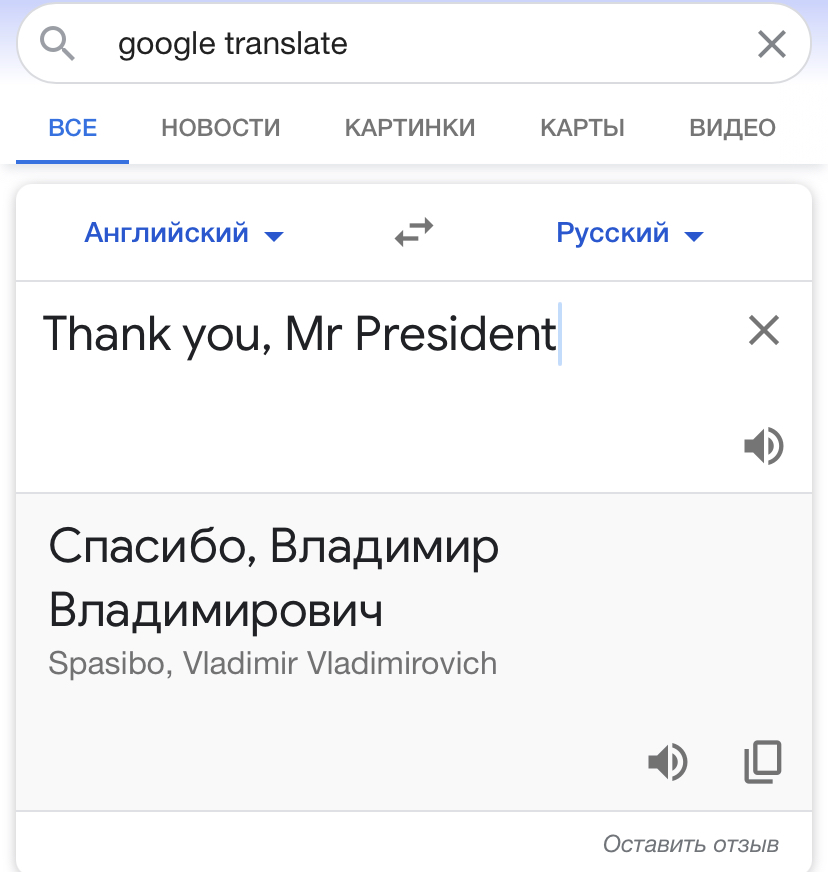 🤷♂️ Переводчик от Google «вписал» имя Путина в перевод фразы «Thank you, Mr President»