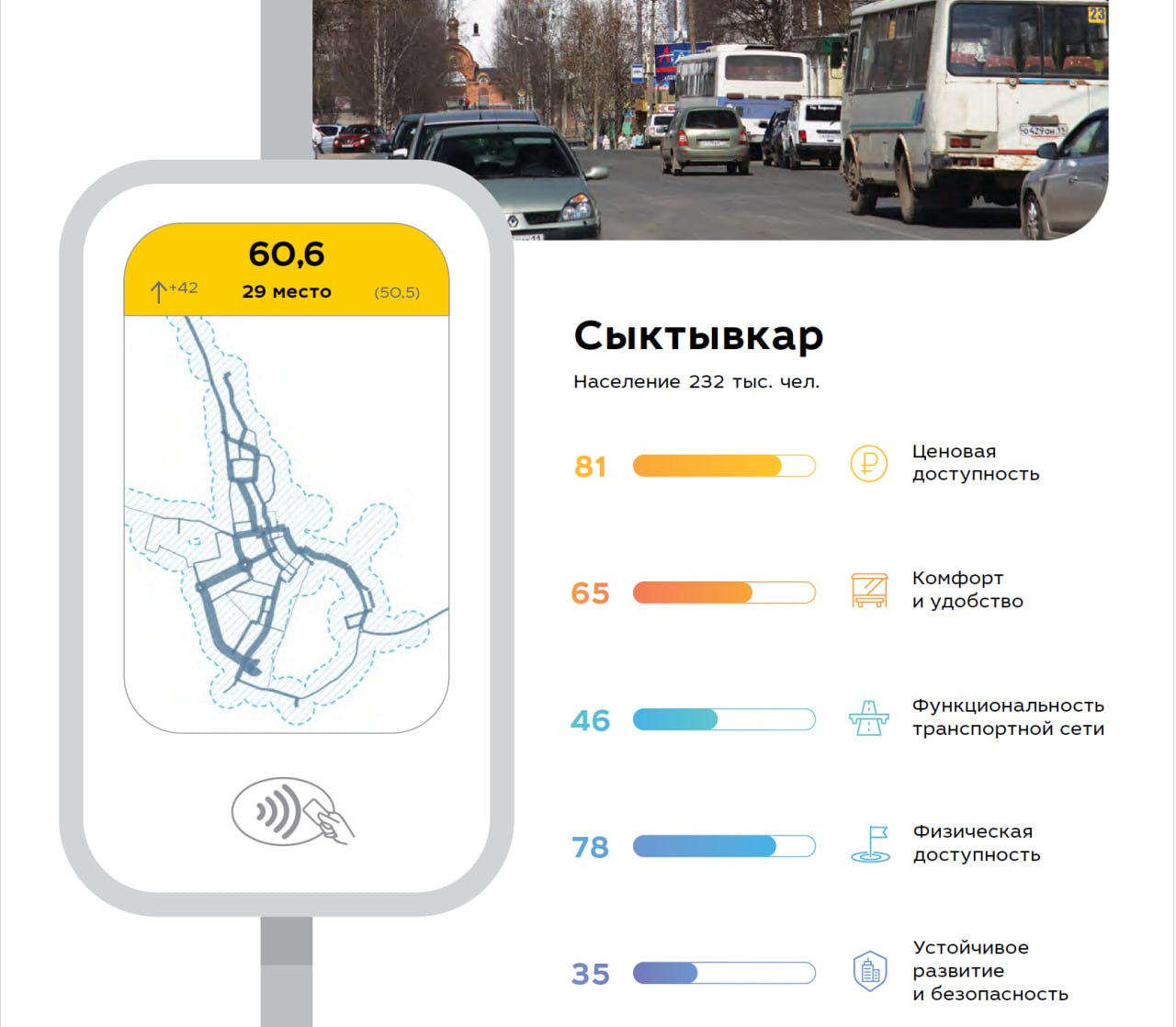 Одним из наиболее заметных результатов исследования стало резкое улучшение позиций Сыктывкара. Столица Коми стала рекордсменом рейтинга по росту за год, поднявшись сразу на 42 позиции. Такой скачок аналитики связывают с проведёнными изменениями в транспортной системе города и постепенным реформированием пассажирских перевозок.