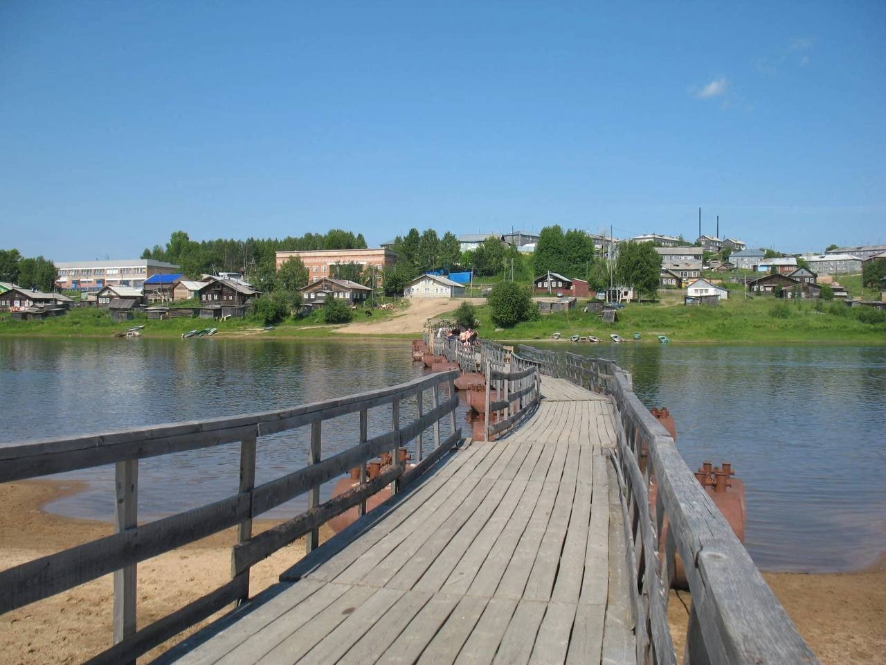 Для объективности картины было бы неплохо взглянуть на мост, который был собран из этих конструкций. Давайте напомним, что это был понтонный мост через реку Мезень напротив села Кослан, что в Удорском районе. Вот тут по ссылке можно посмотреть, что с ним стало.