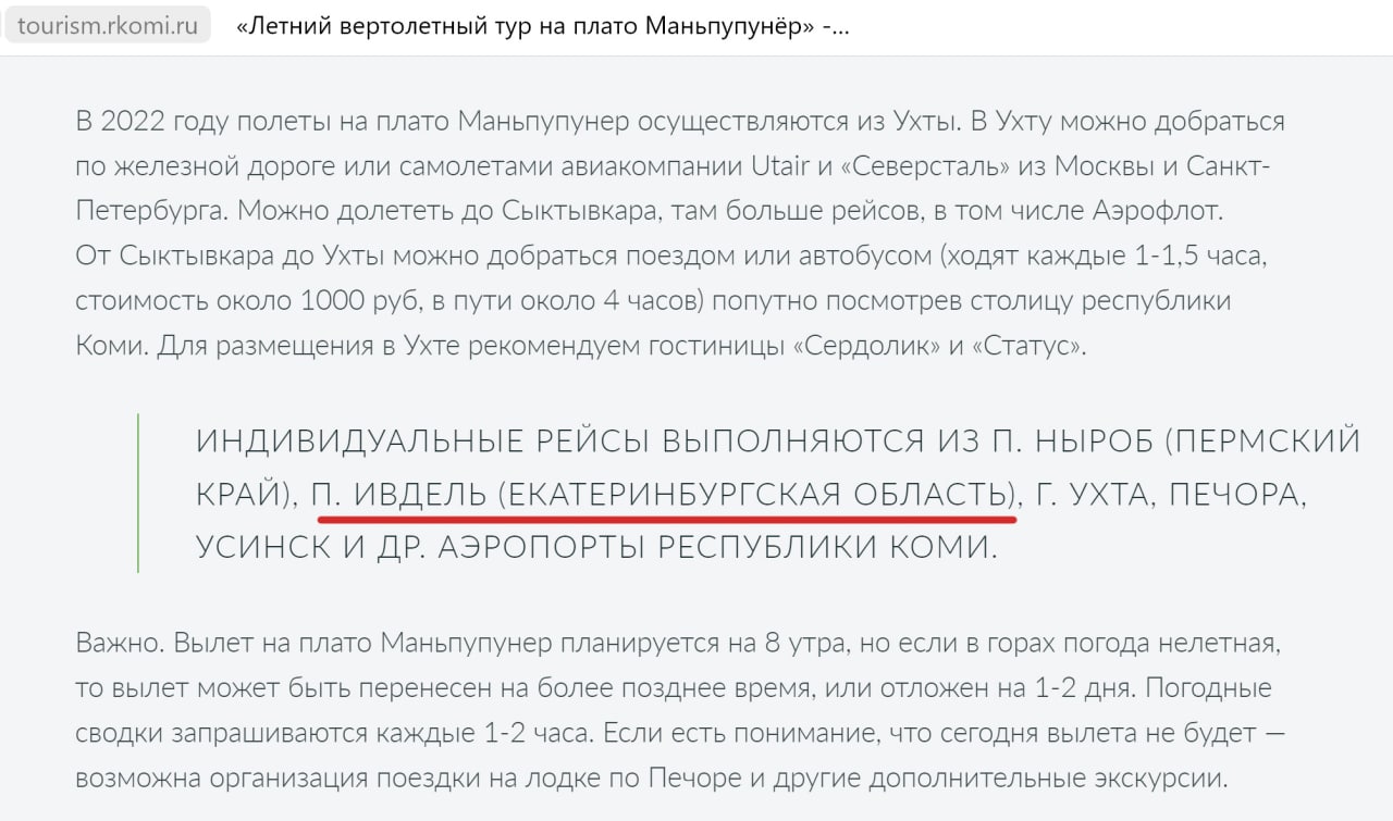 Как можно развивать туризм в Коми, если даже ответственные за организацию туристических продуктов не знают географию. Наши подписчики заметили, что на странице вертолётного тура на плато Маньпупунер есть существенная ошибка, за которую географичка ударила бы указкой по рукам. Помимо копирайтеров должны быть и корректор. Ладно мы, тут в telegram, не можем себе позволить такую должность, но в Минкульте то должен быть такой человек.