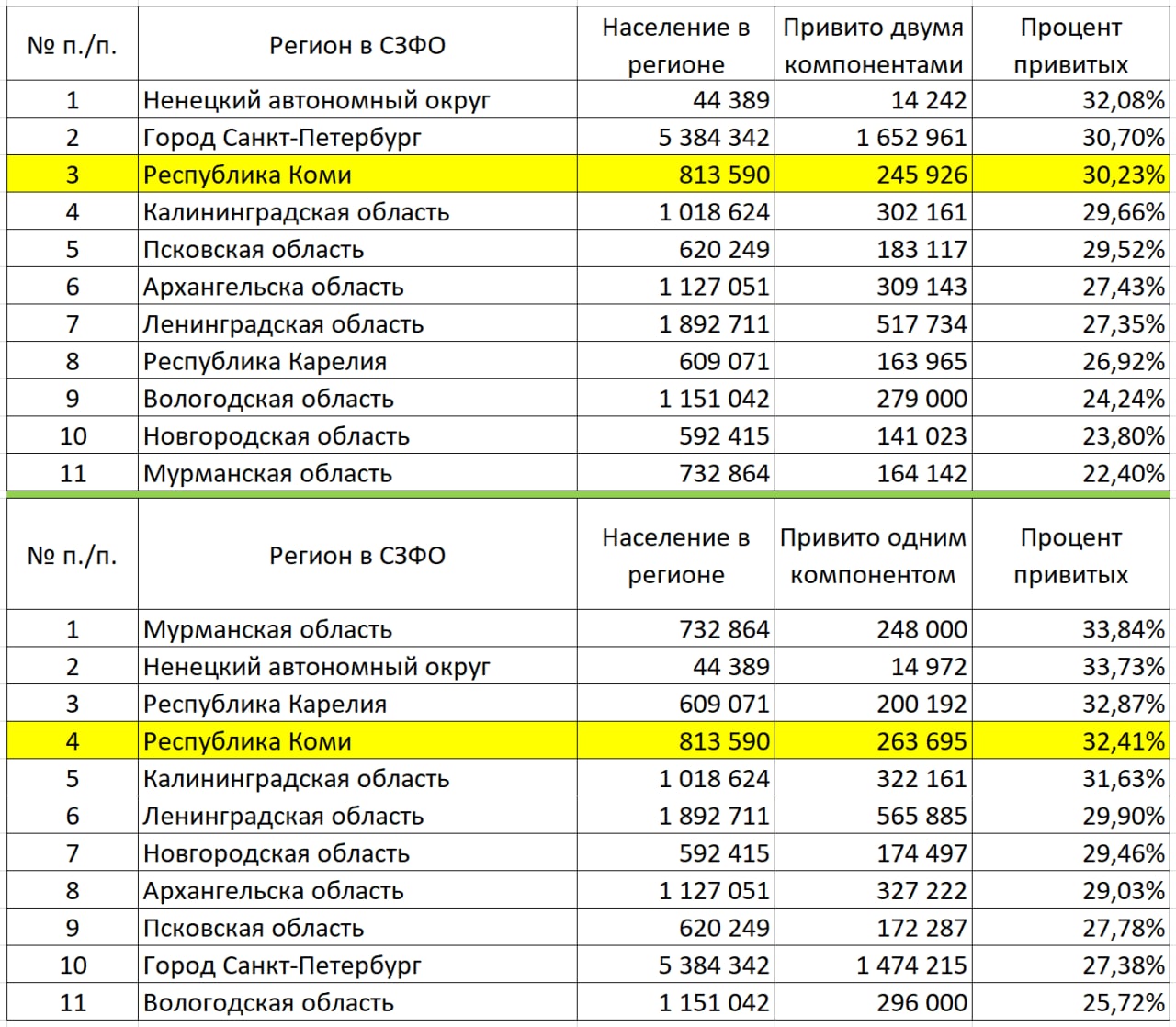 Сегодня Владимира Уйбу упрекают в том, что темпы вакцинации упали. Да, оно так и есть. Но тем не менее по количеству вакцинированного населения, заметим не в числовом выражении, а в процентах, Республика Коми занимает третье место в СЗФО среди тех, кто сделал обе прививки. И четвёртое место среди тех, кто сделал пока что одну прививку.