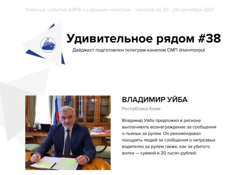В Коми Владимир Уйба предложил выплачивать вознаграждение за сообщения о пьяных водителях. Он рекомендует поощрять людей за сообщения о нетрезвых за рулем также, как за убитого волка — суммой в 20 тысяч рублей. Глава региона вспомнил о ДТП на трассе, пострадавшим которого оказывал первую помощь. Уйба поручил правительству республики проработать порядок действий для реализации инициативы.