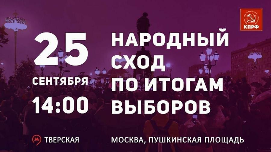 Прошедшие 17 - 19 сентября 2021 года выборы в Государственную Думу восьмого созыва отмечены доселе невиданной по масштабам и по степени наглости чредой нарушений законодательства. К стандартным манипуляциям списками надомников, к вбросам бюллетеней, к провокациям против наблюдателей добавилось фактическое похищение у оппозиции голосов посредством внедрённого электронного голосования. В результате власти чудодейственным способом поменяли местами победителей и проигравших. Жители столицы (и народ России в целом) не желают мириться с беззаконием. Московский городской комитет КПРФ публикует заявление с протестом против фальсификации выборов и призывает как можно больше граждан возвысить голос в защиту законности и справедливости, придя 25 сентября на Пушкинскую площадь на народный сход.