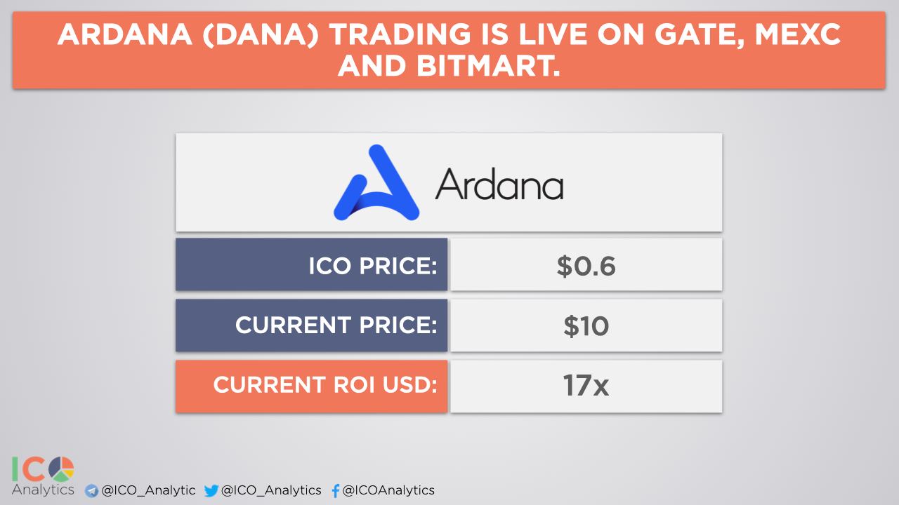 Ardana (DANA) trading is live on Gate, MEXC and BitMart as of November 22. Current market cap: $33M. ICO price: $0.6. Current price: $10. Current ROI: 17x