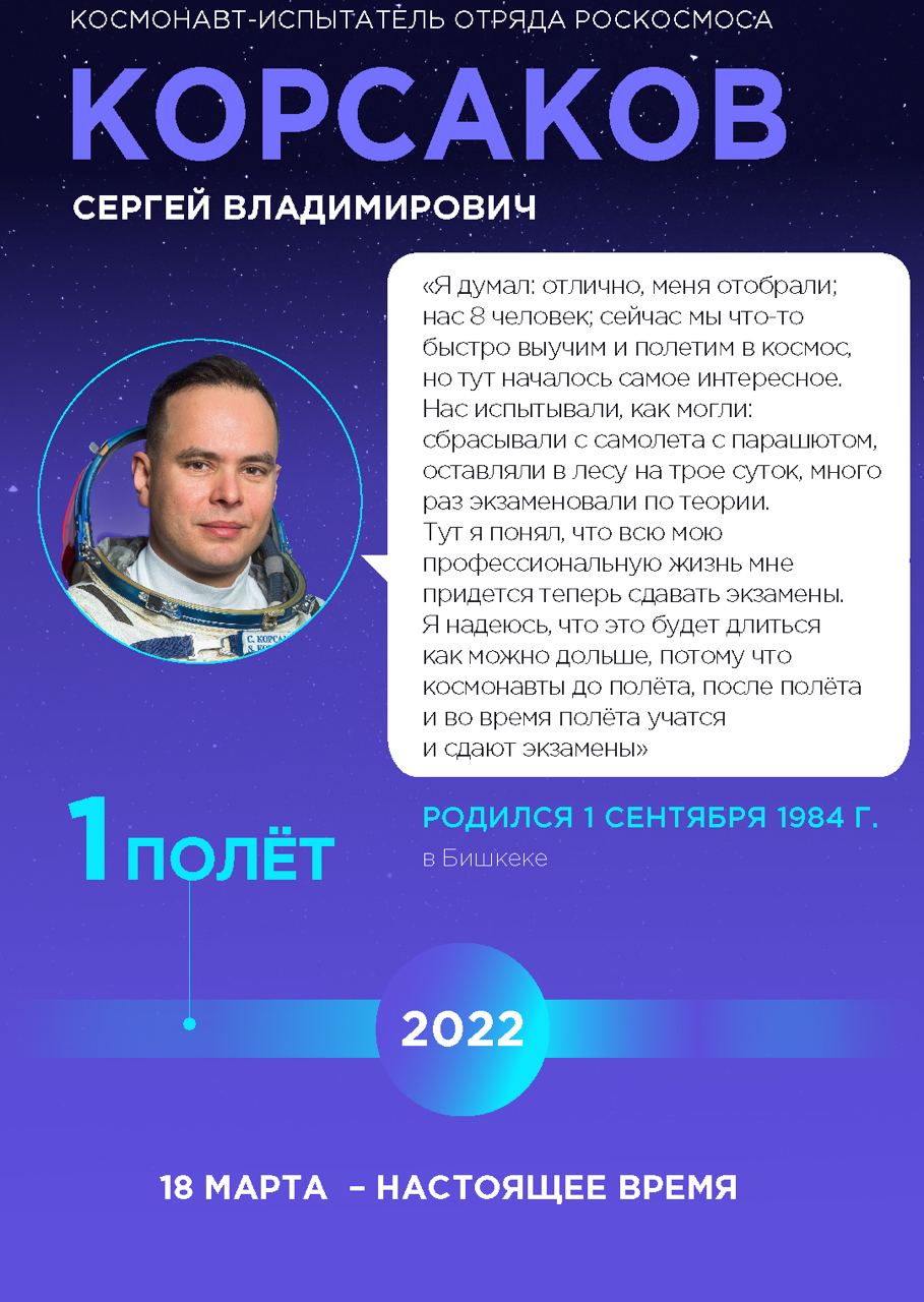 С 18 марта 2022 года Сергей Корсаков вместе с космонавтами Роскосмоса Олегом Артемьевым и Денисом Матвеевым находится на Международной космической станции. Это первый за последние годы полностью российский экипаж. Возвращение на Землю запланировано на 29 сентября 2022 года.