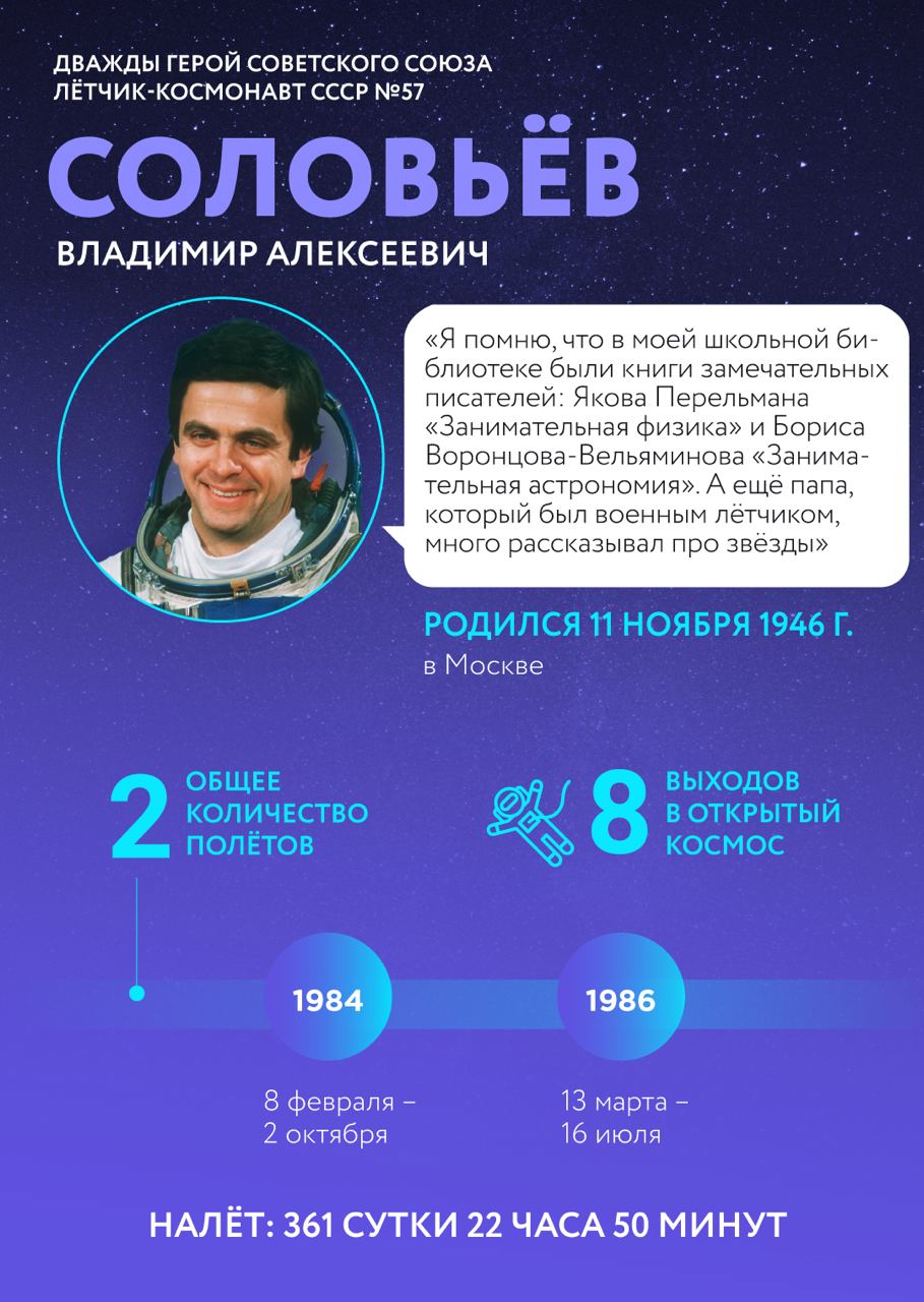 🚀 Сегодня свой день рождения отмечает дважды Герой Советского Союза, лётчик-космонавт СССР № 57, профессор, доктор наук Владимир Алексеевич Соловьёв.