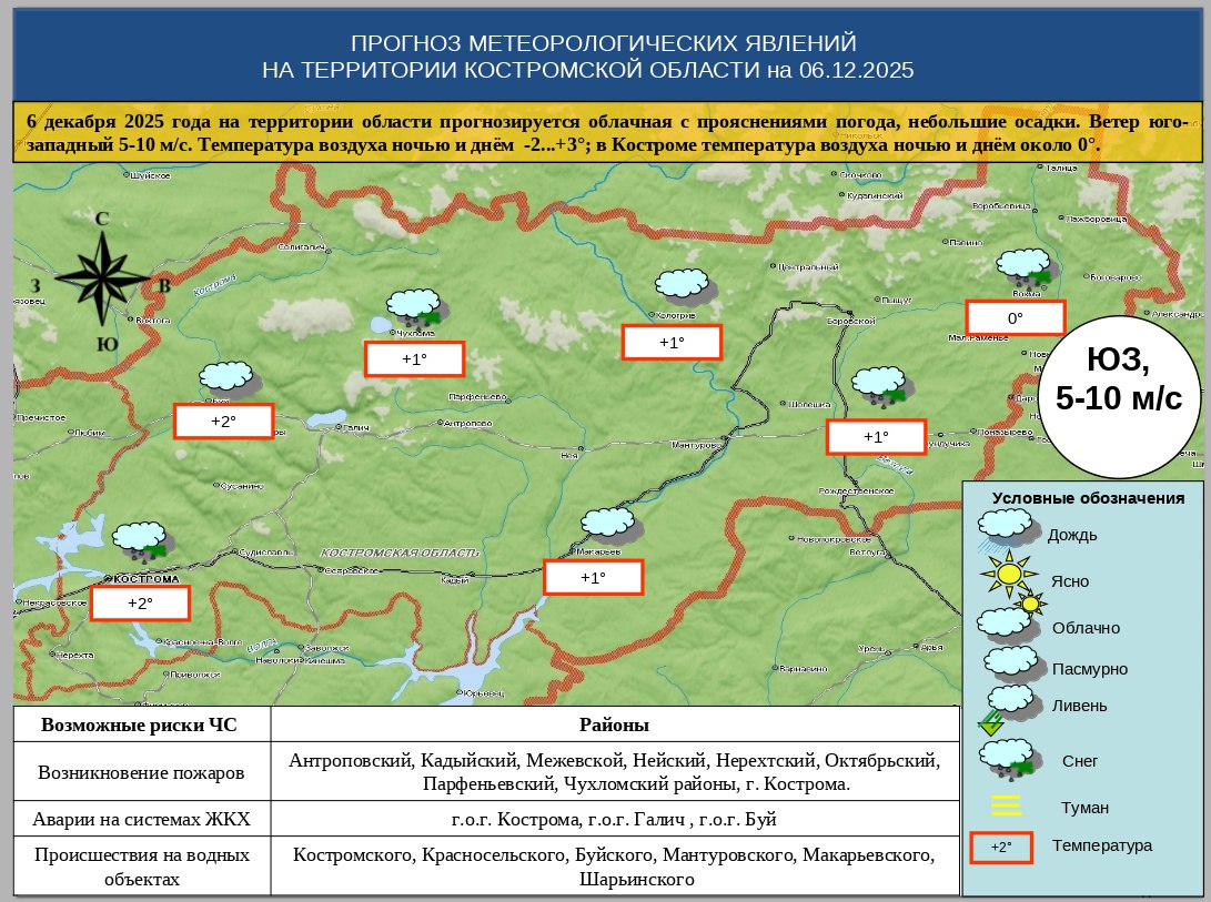6 декабря 2025 года на территории области прогнозируется облачная с прояснениями погода, небольшие осадки. Ветер юго-западный 5-10 м/с. Температура воздуха ночью и днём -2...+3°; в Костроме температура воздуха ночью и днём около 0°.