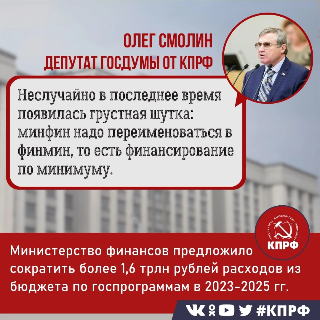 Как отмечает другой депутат Госдумы от КПРФ Олег Смолин: «Неслучайно в последнее время появилась грустная шутка: минфин надо переименоваться в финмин, то есть финансирование по минимуму».